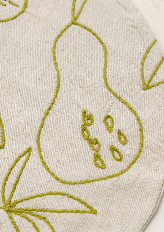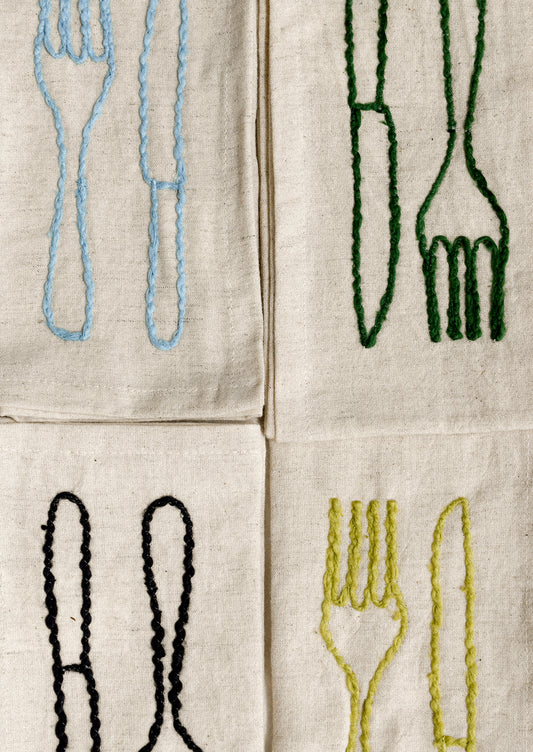 • A set of natural linen napkins with embroidered fork and knife motif in assorted colors.