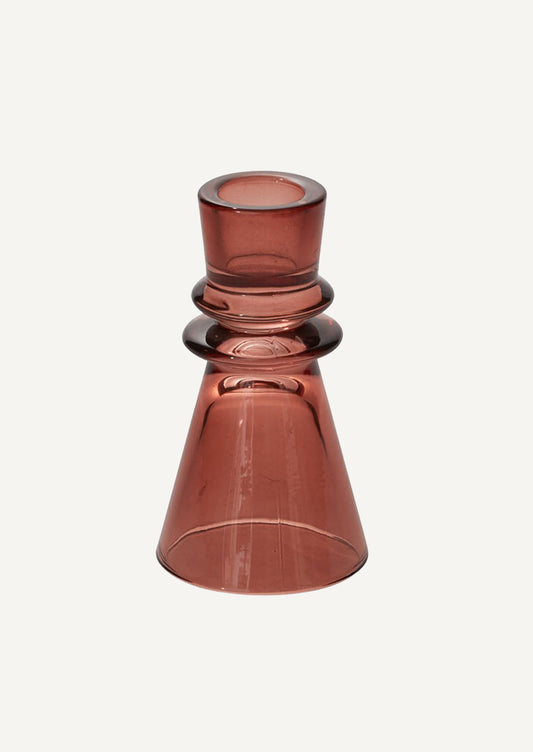 • A pair of burgundy colored glass taper candle holders with tapered geometric shape.