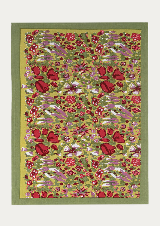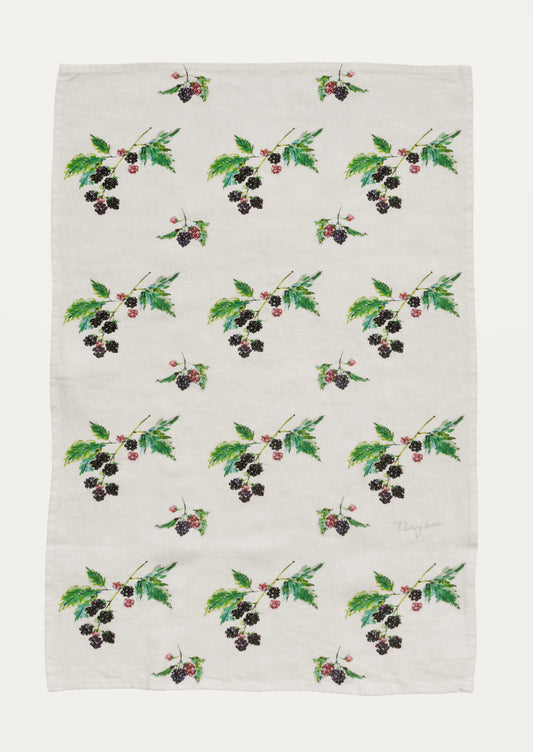 • Close-up of a white cotton tea towel with red cherry illustrations and green stems, with a red scalloped border at one edge.