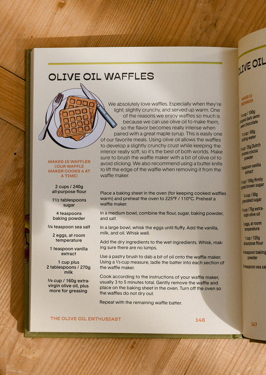 • Book titled 'The Olive Oil Enthusiast' on a wooden surface