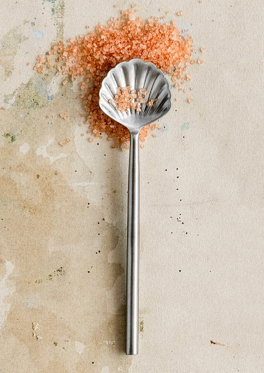 • Gold spoons with shell designs on a light surface next to a bowl of pink salt.