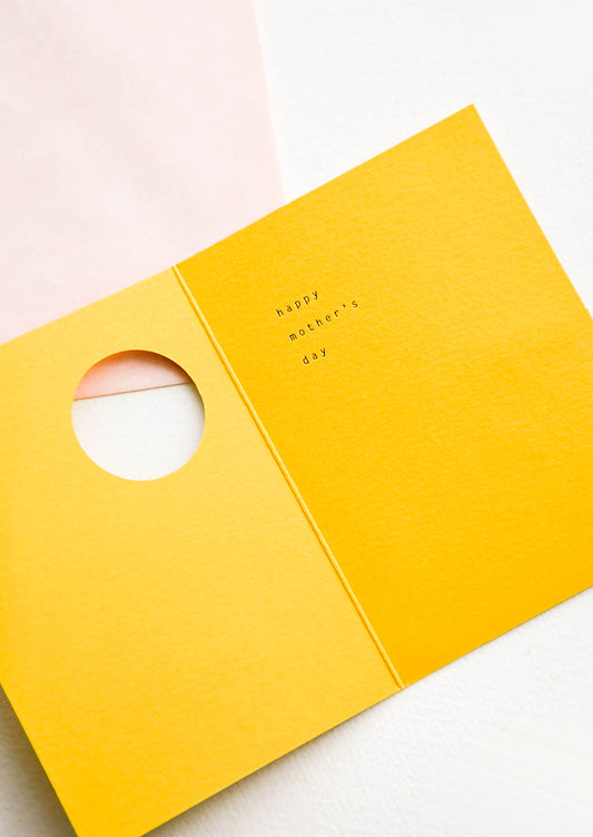 • Yellow greeting card with hand-painted shapes and cutout window revealing "Happy Mother's Day" text