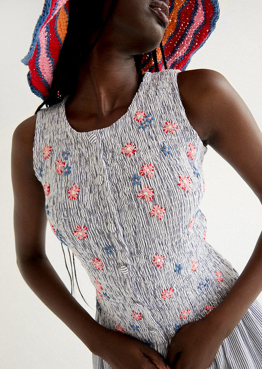 • A woman wearing a long striped seersucker dress with smocked bodice featuring floral embroidery detailing.